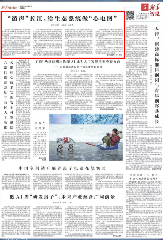 2026年1月8日,新华每日电讯5版以《“循声”长江,给生态系统做“心电图”》为题,报道重庆大学声景研究中心采集长江流域声景样,让大家“听见”长江的生态蝶变,从而引导人们关注生态、保护声景,凝聚生态保护共识。全文如下,一起来看。